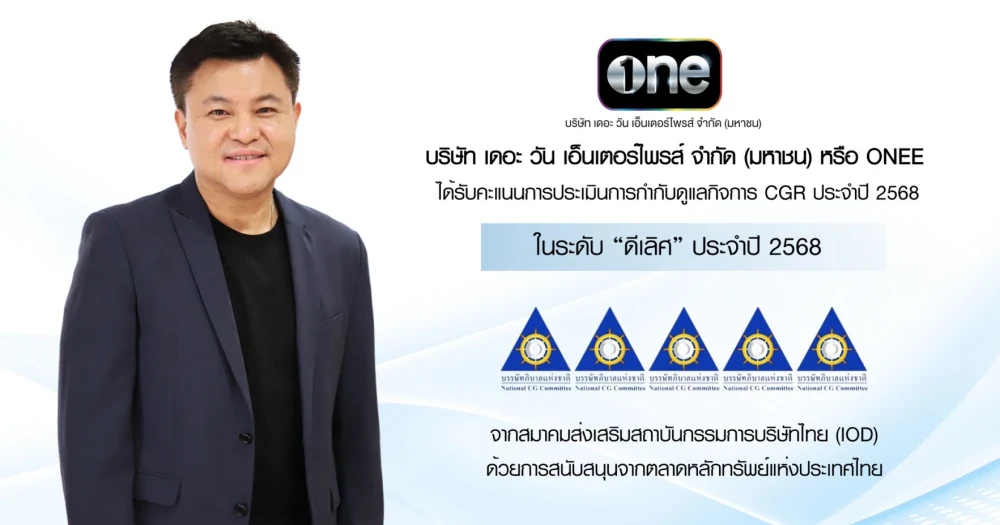 บริษัท เดอะ วัน เอ็นเตอร์ไพรส์ จำกัด (มหาชน) หรือ “ONEE” คอนเทนต์ครีเอเตอร์ชั้นนำครบวงจรของประเทศไทย ที่เป็นมากกว่าช่องทีวี ยังคงได้ดำเนินกิจการได้อย่างยอดเยี่ยม โดยล่าสุด ONEE ได้รับคะแนนการประเมินการกำกับดูแลกิจการในระดับ 5 ดาว หรือ ระดับ "ดีเลิศ" (Excellent CG Scoring) จากการสำรวจด้านการกำกับดูแลกิจการของบริษัทจดทะเบียนไทย ประจำปี 2568 Corporate Governance Report of Thai Listed Companies (CGR) จากสมาคมส่งเสริมสถาบันกรรมการบริษัทไทย (Thai IOD) ภายใต้การสนับสนุนจากตลาดหลักทรัพย์แห่งประเทศไทย (ตลท.) เพื่อยกระดับธรรมาภิบาลไทยสู่มาตรฐานสากล เพื่อการเติบโตอย่างยั่งยืนของตลาดทุนไทย